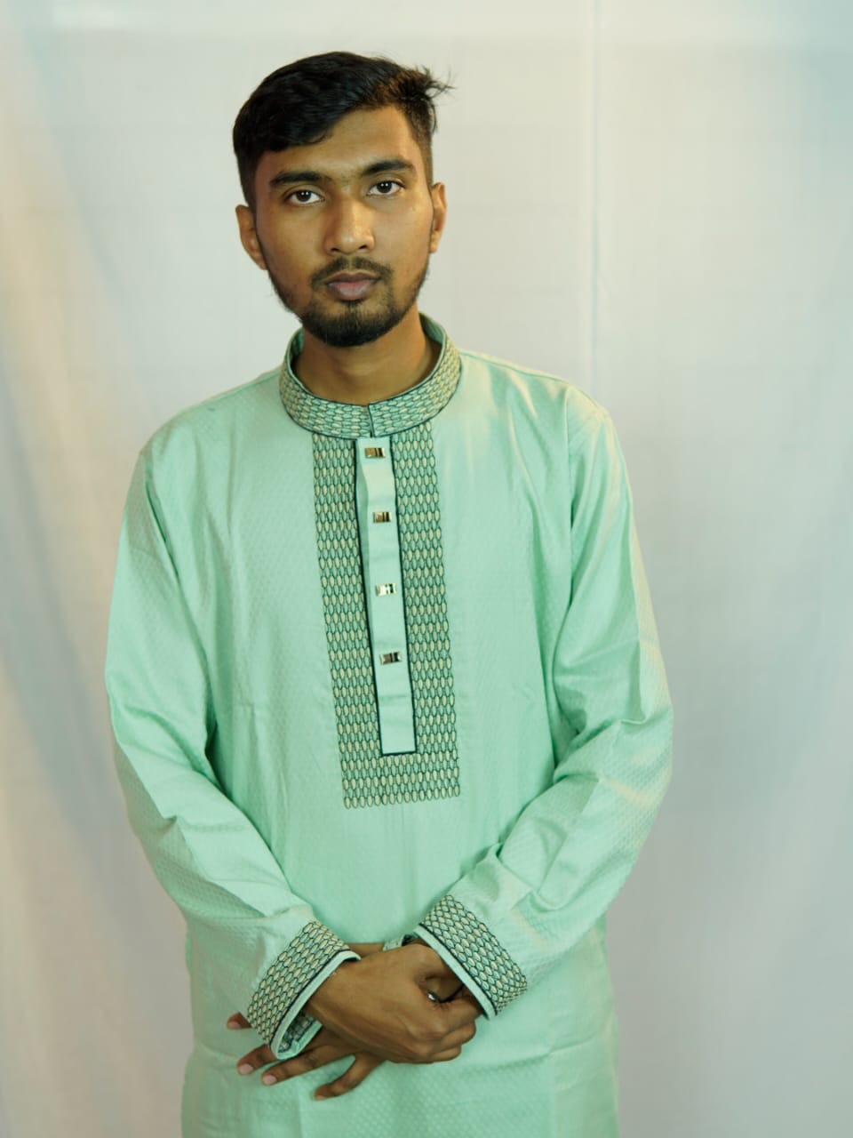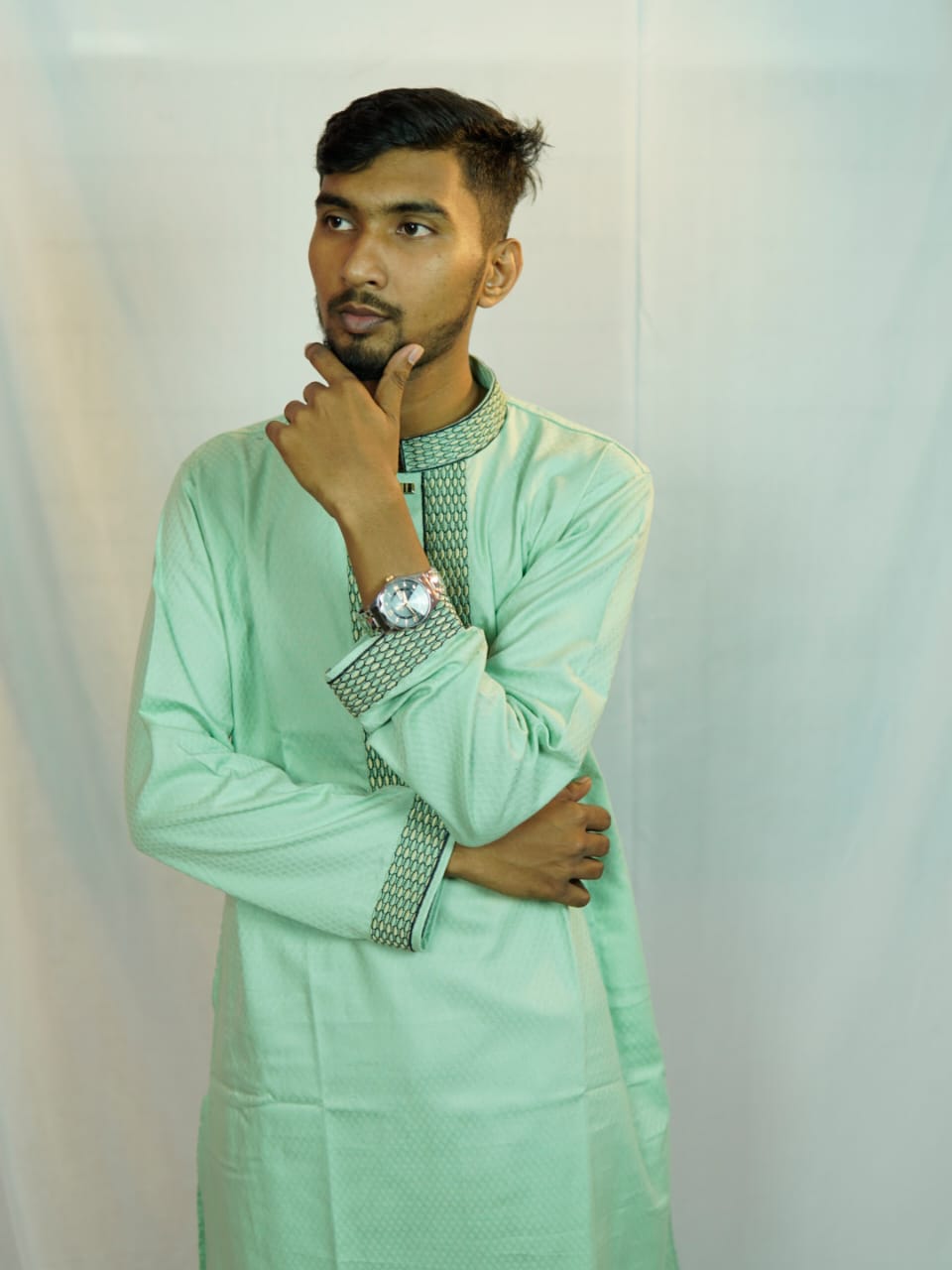 স্টাইল আর আরাম দুটোরই সমন্বয় নিয়ে এসেছে এই প্যাস্টেল সবুজ রঙের পাঞ্জাবি। প্রিমিয়াম কাপড়ের তৈরি হওয়ায় এটি গরম কিংবা শীত—যেকোনো মৌসুমে আরামদায়ক। কলার ও বুকে রয়েছে আকর্ষণীয় নকশার কাজ, যা এটিকে দিয়েছে এক অনন্য লুক। সাদামাটা অথচ পরিশীলিত ডিজাইন আপনাকে দেবে স্টাইলিশ লুক। উৎসব, বিশেষ দিন কিংবা নিয়মিত ব্যবহার—সবখানেই এটি মানানসই।